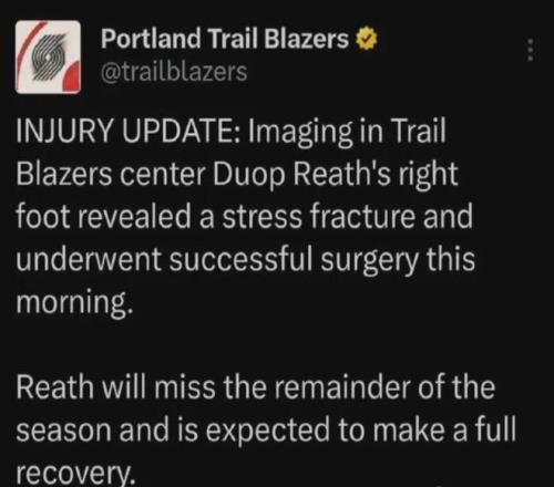 開拓者官宣:里斯應(yīng)力性骨折,缺席本賽季剩余比賽,預(yù)計(jì)將完全康復(fù)。