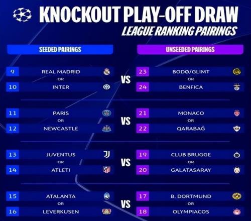 根據(jù)本賽季歐冠全新賽制,附加賽不再采用完全隨機抽簽,而是嚴格依據(jù)“聯(lián)賽階段”(即原小組賽)的最終排名進行配對:第9至16名球隊為種子隊,第17至24名為非種子隊。種子隊將在次回合坐鎮(zhèn)主場,看似占據(jù)優(yōu)勢,但一旦首回合失手,次回合的壓力將空前巨大。 更值得注意的是,歐足聯(lián)已徹底取消“同國回避”原則。這意味著從附加賽開始,同一聯(lián)賽的球隊就可能提前交鋒——例如巴黎圣日耳曼對陣摩納哥;甚至可能出現(xiàn)“老對手重逢”的局面,比如皇馬再次遭遇本菲卡——正是后者在聯(lián)賽階段末輪以4比2擊潰皇馬,直接導致后者跌入附加賽。