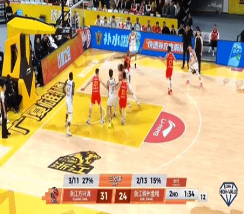 第二節(jié),前半節(jié)5分鐘浙江持續(xù)進攻啞火失誤一分不得,廣廈塔克、桑普森持續(xù)反擊得分一波13-0反超7分,節(jié)中浙江劉澤一、約翰遜內線艱難拿到6分,但節(jié)末2分鐘浙江再度啞火,廣廈布朗、胡金秋、朱俊龍一波7-0將分差拉大至兩位數,半場戰(zhàn)罷,廣廈35-24浙江。 桑普森搶斷反擊一條龍頂開防守打進